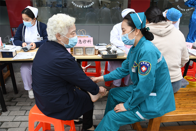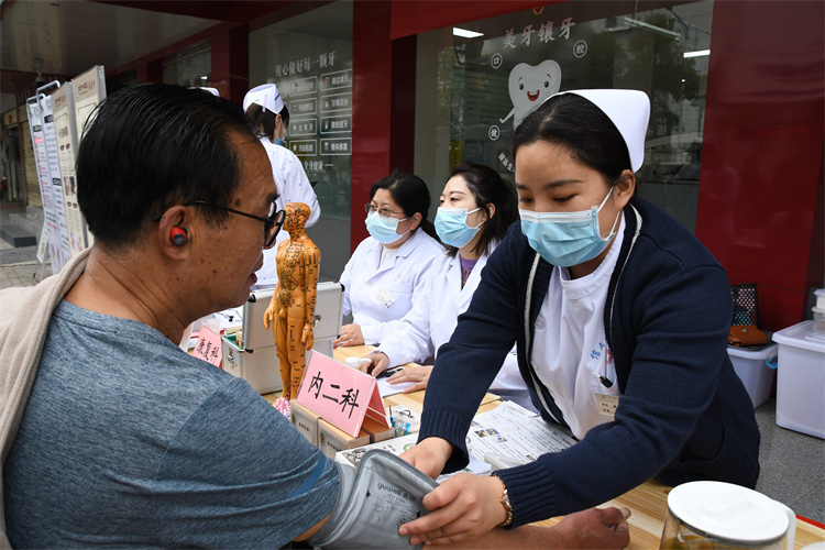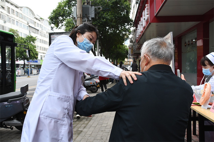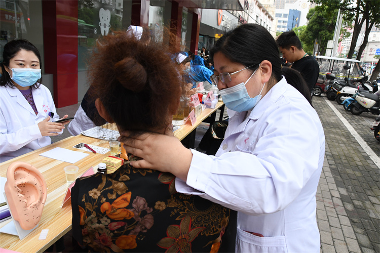 活動(dòng)現(xiàn)場(chǎng),醫(yī)護(hù)人員免費(fèi)為前來(lái)咨詢(xún)的群眾測(cè)量血壓、血糖、血氧飽和度,發(fā)放健康宣教資料并現(xiàn)場(chǎng)演示教學(xué)八段錦。其中中醫(yī)特色護(hù)理技術(shù)備受追捧,有肩頸痛、腰酸背痛、慢性關(guān)節(jié)炎等疼痛困擾的老街坊們紛紛排隊(duì)體驗(yàn)耳穴貼壓、火龍罐、刮痧及針灸等服務(wù)項(xiàng)目。