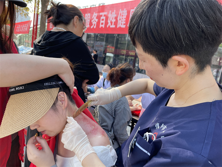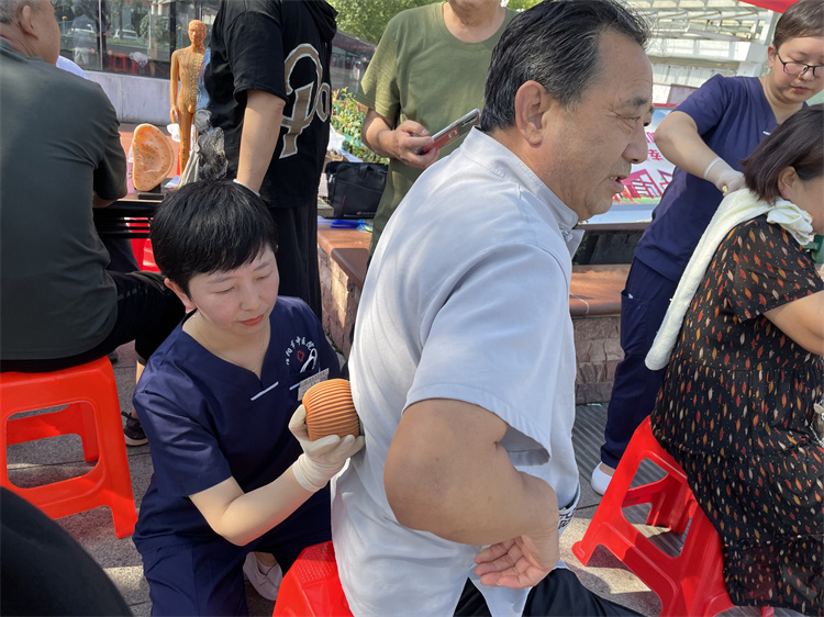 60多的劉大爺“三陽”后出現(xiàn)頭暈乏力、四肢疲軟的癥狀,在義診現(xiàn)場醫(yī)生根據(jù)他的體質(zhì)和癥狀表現(xiàn),建議他可以結(jié)合中藥內(nèi)服結(jié)合中醫(yī)外治療法進(jìn)行治療。內(nèi)科中醫(yī)護(hù)理人員通過辨證施護(hù),讓劉大爺體驗(yàn)了銅砭刮痧和火龍罐,可起到舒筋活絡(luò)、活血化瘀的作用。隨著就診人員增多,多名有頸椎、背部、腰部等部位疼痛的中老年人,紛紛前來體驗(yàn),經(jīng)過中醫(yī)理療,表示疼痛癥狀均有緩解。