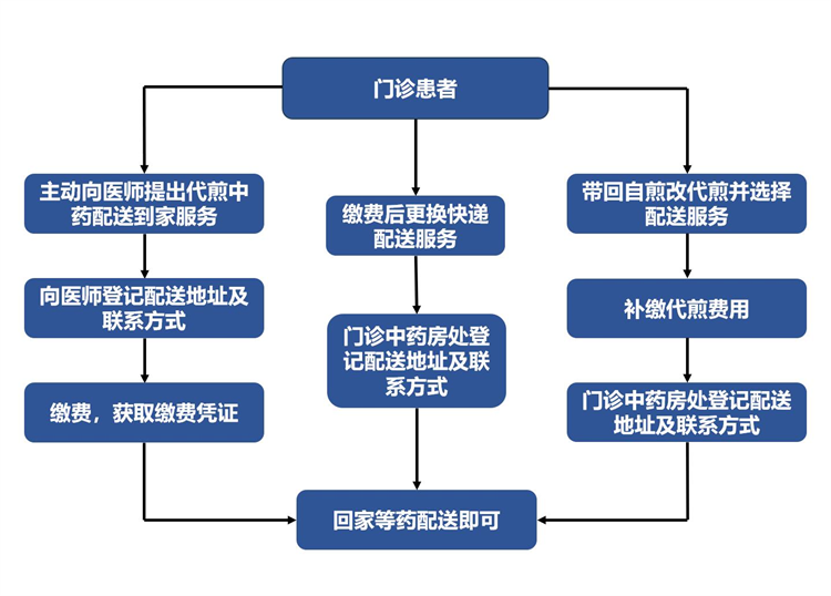 代煎配送是醫(yī)生開具處方后,我院智慧共享中藥房負(fù)責(zé)調(diào)劑、煎煮、包裝后統(tǒng)一由郵政快遞配送至患者指定地點。