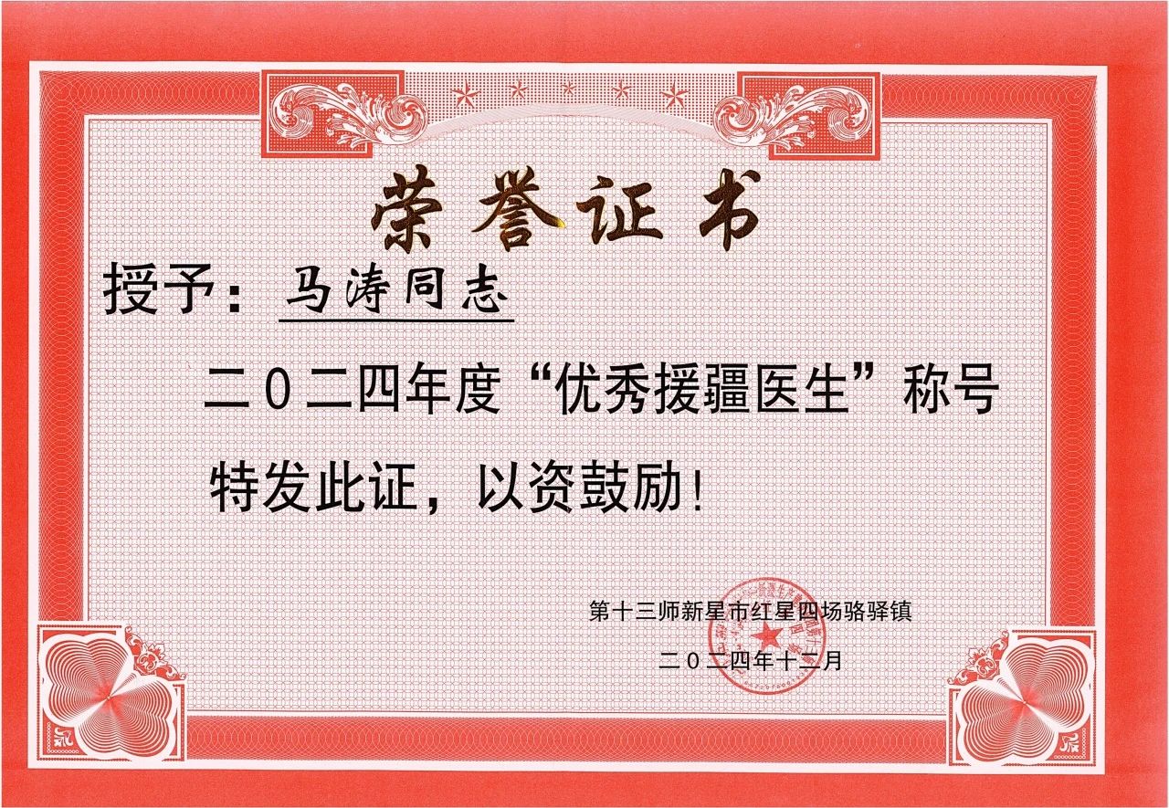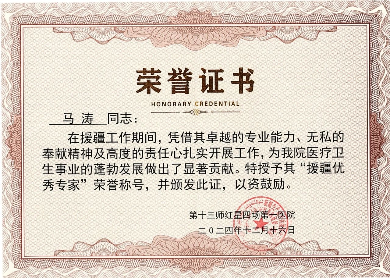 有志而去,有為而歸。援疆期間,馬濤同志的努力和付出得到當(dāng)?shù)睾褪茉t(yī)院高度的認(rèn)可和好評(píng),獲得2024年度“優(yōu)秀援疆醫(yī)生”以及“援疆優(yōu)秀專家”榮譽(yù)稱號(hào)。